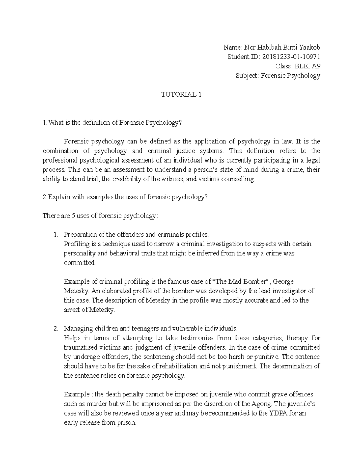 Forensic Psychology Tutorial 1 Nor Habibah A9 Name Nor Habibah Binti Yaakob Student Id Studocu